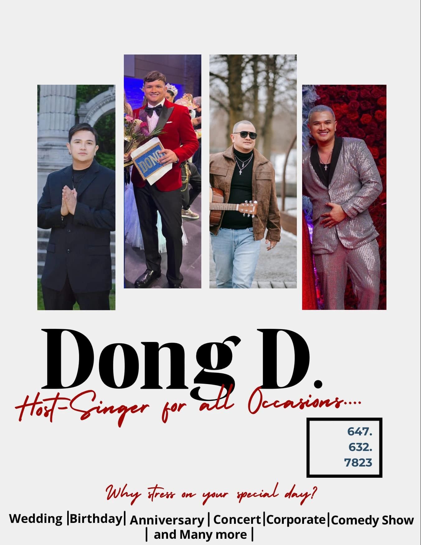 Dong D. is Toronto's Foremost host-singer comedian. He is one of the busiest and booking him as your Mc is quiet challenging now. He specialized in hosting private events like Weddings, Birthday, Anniversaries, corporate parties, and many more! You may have seen him in a lot of concerts too, both local and international (HOST OF BINI TORONTO AND WINNIPEG, HOST OF KPOP ARTIST GOT7 BAMBAM TORONTO AND CALGARY, HOST OF MOIRA, CHRISTOPHER DE LEON, DONEKLA, SUNKISSED LOLA, THE JUANS, KIAN CIPRIANO, ASIN, AEGIS, and many more!) , festivals like Philippine Extravaganza, Mabuhay Festival, and even his own self-produced shows and charity concerts. He is one of the busiest host-singer-comedian here in Toronto and other clients would fly him to other cities in Canada just to have him as MC for their weddings and other parties! He just brings so much energy and hype to the concert-goers. His enthusiasm is undeniable. He will surely charm the audience with his wit and humor! Create a title for this and short description
